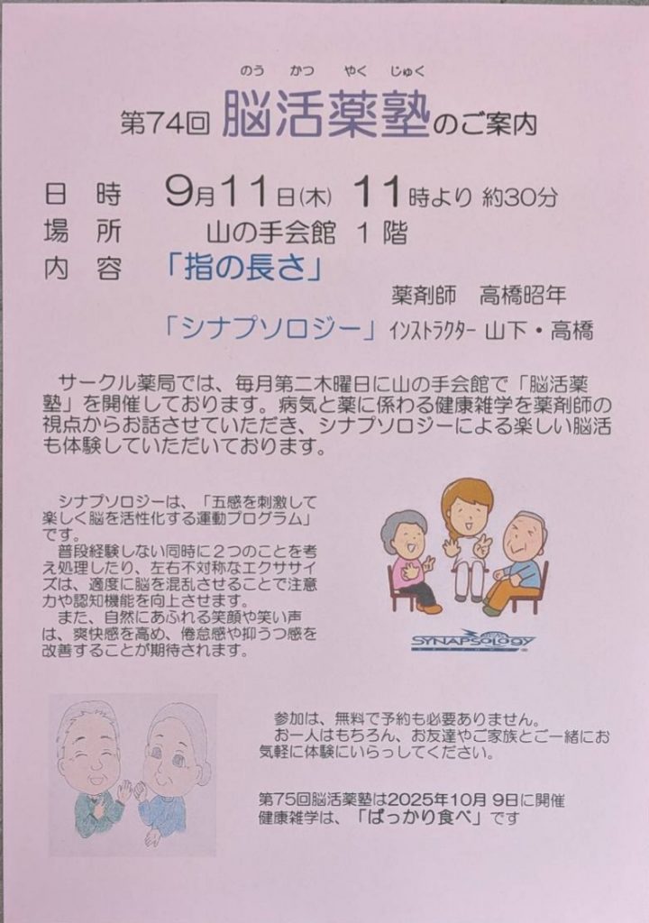 楽しく脳を活性化するシナプソロジーや健康にかかわる雑学(今回は指の長さについて)を薬剤師からお話させて頂きます。